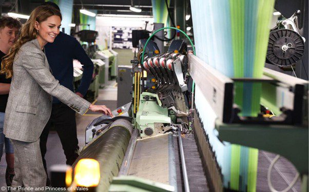 In September, the Princess of Wales was welcomed to Sudbury Silk Mills by Managing Director Julius Walters, who is the10th generation of the Walters family, alongside Geoffrey Probert HM Deputy Lord-Lieutenant, Cllr. Andy Welsh the Mayor of Sudbury, and members of the national press. Natalie Mumford, Director of Humphries Weaving, acted as host for the visit and was delighted to introduce the specialists within the mill.