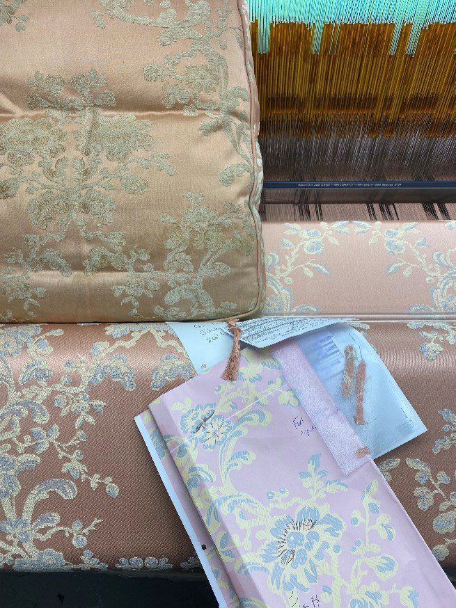 In July, we were winding a custom coloured warp for the Gretchen Brocatelle, in Gretchen Gold, a historic project which we worked closely with Clean Edge System and the house owner, to create the perfect gold silk for wall upholstery.